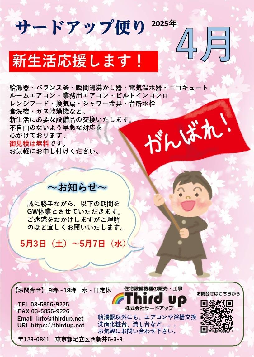 新生活応援! 2025/04/01 サードアップ便り4月号 新社会人、新入学の皆様 おめでとうございます! 新生活で、設備品等の不便を感じたら 是非弊社にお問い合わせください。 給湯器をはじめ、バランス釜、湯沸かし器 エコキュート、ビルトインコンロ、水栓など 早急な対応を心がけております。 御見積は無料です。 弊社も今年で7年目となりました。 ここまで続けてこられたのも、 ひとえにお客様のご愛顧のおかげでございます。 ありがとうございます。 これからも引き続き宜しくお願いいたします。