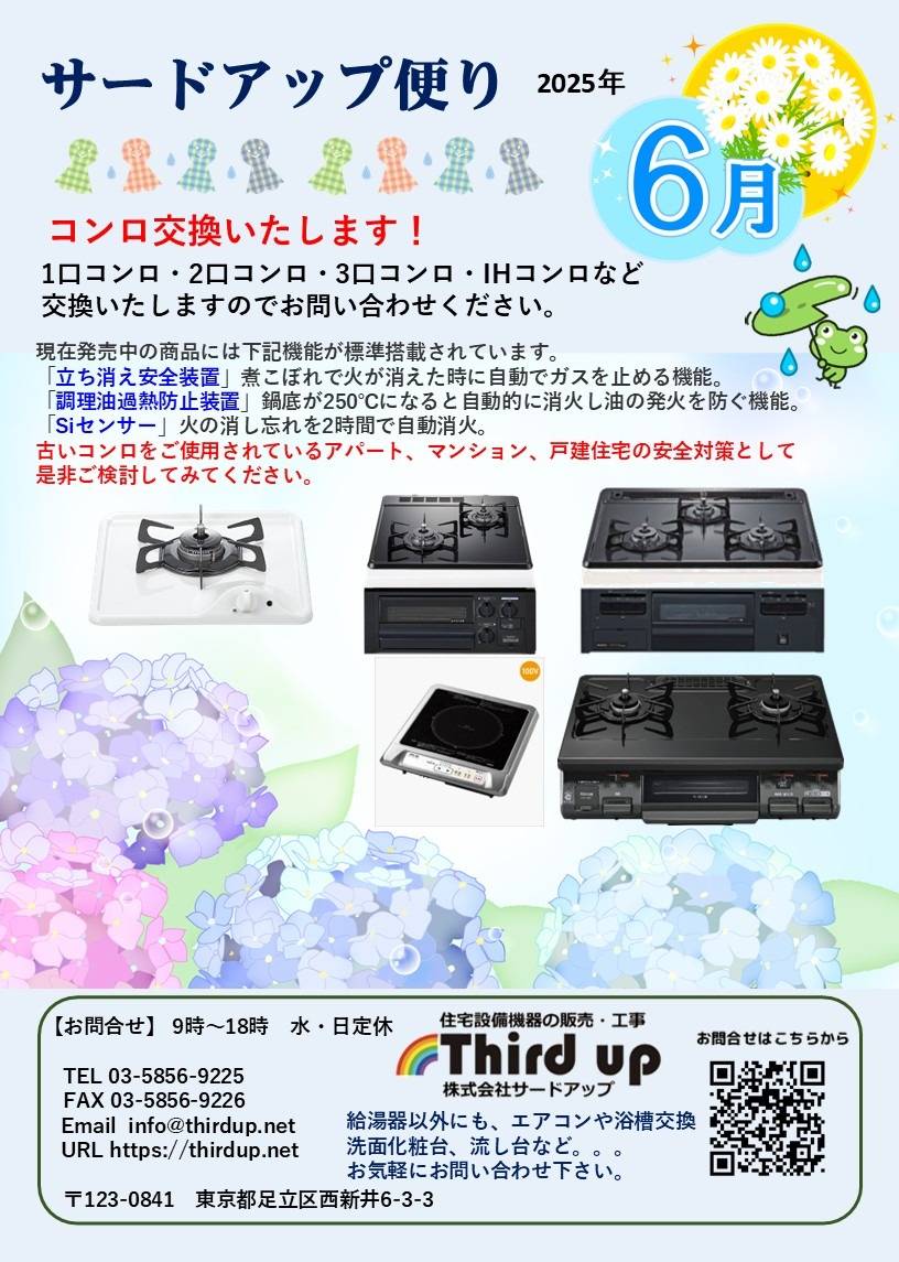 コンロ交換いたします 2025/06/02 サードアップ便り6月号 お仕事お疲れ様です! 6月になりました。 毎日本当にあっという間に過ぎてしまって、 1日24時間ある?って思う今日この頃。 皆様お変わりありませんか? さて、今月のサードアップ便りは、 コンロ交換のお話しです。 古いコンロには、 「立ち消え安全装置」・ 「調理油加熱防止装置」・「Siセンサー」などの 安全装置がついていません。 古いコンロを使用されている アパート、マンション、戸建住宅の 安全対策として是非ご検討してみてください。 今月は梅雨の季節です。 エアコンの除湿機能を使いながら 快適にお過ごしください。 今月も宜しくお願いいたします