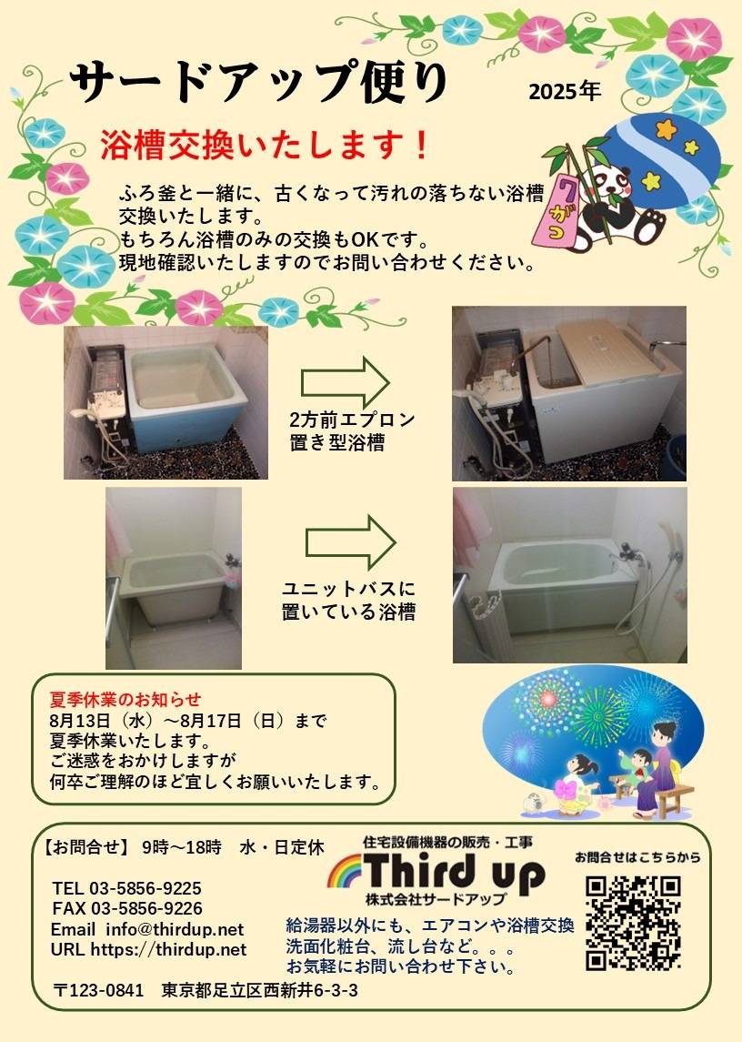 浴槽交換いたします 2025/07/01 サードアップ便り7月号 毎日暑い中お疲れ様です。 お元気ですか? 今年ももう下半期突入! あせらずのんびり楽しく過ごしたいな~と思います。 さて、今月のサードアップ便りは、 浴槽交換のお話しです。 たま~に、表面がボコボコしたもの、 割れているものなど見かけます。 バランス釜や給湯器交換の時でもいいのですが、 浴槽のみでも交換いたしますので お気軽にお問い合わせ下さい。 浴槽だけの交換が困難な場合もございます。 現地確認は無料です。 水分補給をしながら暑さを乗り切りましょう。 今月も宜しくお願いいたします